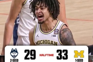 瘋?cè)龥Q賽上半場(chǎng):密歇根三分8中0 仍33-29領(lǐng)先康涅狄格