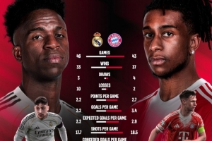 體育資訊4月7日訊 北京時間明天凌晨,拜仁將在歐冠1/4決賽首回合比賽中客場對陣皇馬,拜仁官方更新社媒動態(tài),曬出了兩隊本賽季的數據。