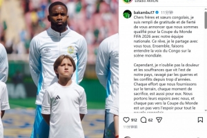 巴坎布社媒曬出自己在國家隊的照片,并寫道:“親愛的剛果兄弟姐妹們,我懷著無比的感激與自豪向大家宣布——我們的國家隊已成功晉級2026年世界杯!這個夢想,我與你們所有人共同分享。讓我們攜手在世界舞臺上發出剛果的聲音。”