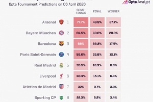Opta預測晉級歐冠四強概率:槍手77.7%最高,巴薩68%、拜仁64.5%