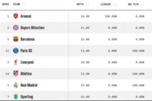 Opta歐冠奪冠概率:阿森納33%居首,拜仁次席,皇馬2.84%跌至第七