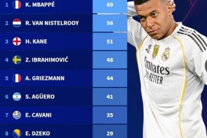 德轉列從未奪冠的歐冠射手榜:姆巴佩69球、范尼56球、凱恩51球