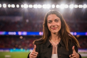 體育資訊4月9日訊 歐冠1/4決賽首回合,巴薩在諾坎普迎戰(zhàn)馬競(jìng)。本場(chǎng)比賽,巴薩女足球星邦馬蒂出現(xiàn)在現(xiàn)場(chǎng)為紅藍(lán)軍團(tuán)加油助威。
