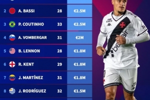 德轉(zhuǎn)自由球員身價榜:庫蒂尼奧250萬歐第3,阿里僅剩100萬歐第10