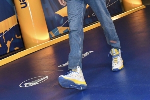 “他應該是從球鞋珍藏柜里拿出來的吧,”詹姆斯笑著說,“我記得他穿過那雙,我不知道是不是他的新秀年。他是哪一年進聯盟的,10-11年嗎?好吧,是09-10年,所以那是詹姆斯10代吧,我記得他以前在比賽中穿過那雙,我不確定他是不是有一雙額外的,這雙可能就是那雙,他應該是從球鞋珍藏柜里拿出來的吧。”