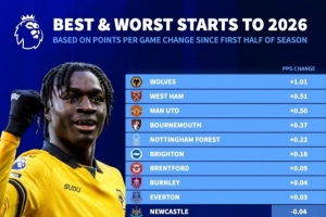 體育資訊3月27日訊 德國轉會市場統計了2026年英超球隊的場均積分,并與球隊上半賽季的場均積分比較,列出英超球隊場均積分變化排名,狼隊+1.01分居首,熱刺-1分墊底。