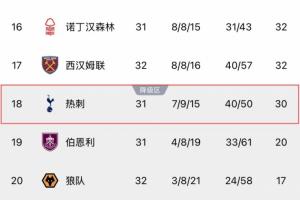 跌入降級區!熱刺反超西漢姆成為最新降級熱門,降級概率達39%