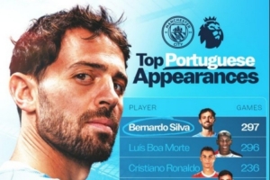 B席英超297次出場創(chuàng)葡萄牙球員紀錄,C羅、B費、若塔均在前五