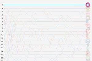 數據機構Football Meets Data曬出了本賽季德甲排名的走勢圖,拜仁從首輪6-0萊比錫開始,一直穩坐榜首。相比之下其余17支的球隊的排名則不斷上下變動。