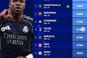 德轉(zhuǎn)左邊鋒身價榜:維尼修斯1.5億歐居首,K77以9000萬歐位居次席