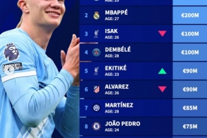 體育資訊4月13日訊 德轉(zhuǎn)更新了足壇中鋒身價情況,哈蘭德和姆巴佩均兩億歐,伊薩克、登貝萊均1億歐緊隨其后。