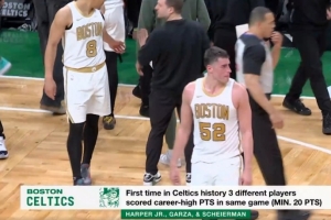 此役,小哈珀得到27分、加爾扎得到27分、謝爾曼得到30分,皆為個(gè)人生涯新高。