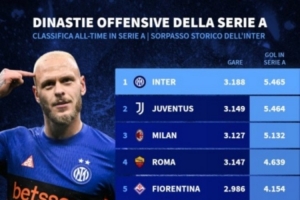 意甲歷史進球榜:國米超越尤文登頂,米蘭、羅馬、佛羅倫薩前五