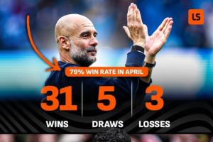 據Livescore統計,四月是瓜迪奧拉執教球隊在英超表現最好的月份,勝率高達79%,而四月卻是阿爾特塔執教阿森納表現最差的月份,勝率僅42%。