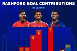 體育資訊4月15日訊 巴薩將在本輪歐冠再戰馬競,拉什福德的表現將至關重要,《轉會市場》統計顯示拉什福德本賽季直接參與進球數已可排在生涯第4位。
