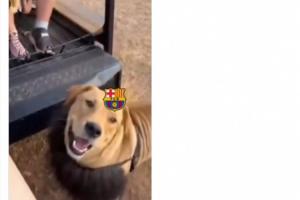 視頻中,一只獅子被加上了巴薩隊徽,跑到帶著馬競隊徽的人身前,被薅下頭套,下面是條狗。