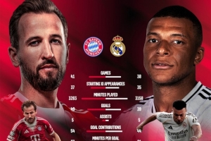 體育資訊4月15日訊 北京時間明天凌晨,拜仁將在歐冠1/4決賽次回合比賽中主場對陣皇馬,首回合拜仁2-1取勝。拜仁官方社媒曬出了凱恩、姆巴佩本賽季的數據。