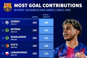 體育資訊4月15日訊 巴薩在本輪歐冠客場(chǎng)2-1擊敗馬競(jìng)、總比分2-3出局。亞馬爾在本場(chǎng)比賽迎來(lái)個(gè)人生涯150場(chǎng)并取得進(jìn)球,也躋身巴薩隊(duì)史自1990年以來(lái)的同期直接參與進(jìn)球榜前十。