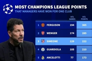 執(zhí)教單一俱樂部歐冠拿分榜:(淘汰賽勝利計為3分)