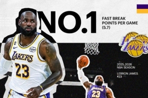 體育資訊4月16日訊 今日,湖人官推更新一張海報,祝賀球星詹姆斯本賽季常規賽場均快攻得分5.7分聯盟第一。