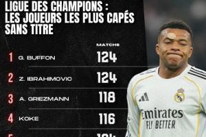 98場0歐冠!未奪歐冠出場次數(shù)榜:姆巴佩第9,布馮伊布124場第一