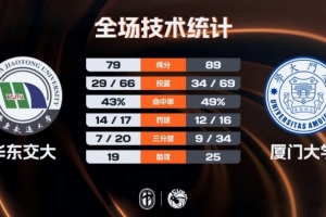 比賽上來,廈門大學率先進入狀態連拿6分搶下開局,首節打了兩分鐘之后華東交大才由李嘉宸罰球打破僵局,這一節廈門大學攻勢如潮單節狂轟34分,分差也達到兩位數,首節結束,廈門大學34-22領先華東交大。