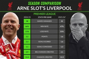 25-26賽季:32輪,勝率47%、負率31%,場均1.6分,場均1.6進球、1.3失球,場均創造2.1重大機會、創造12.3機會,凈勝球+10,場均對方禁區內觸球35次,聯賽排名第5