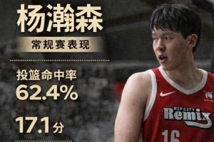 楊瀚森在常規(guī)賽出戰(zhàn)了14場(chǎng),投籃命中率62.4%,三分球32.1%,罰球命中率75%,場(chǎng)均17.1分9.2籃板3.1助攻0.7搶斷1.6蓋帽。