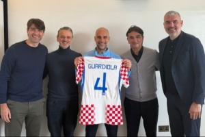 隨達利奇一同造訪曼徹斯特的還有技術(shù)總監(jiān)普萊蒂科薩以及教練組成員喬爾盧卡、盧卡·米蘭諾維奇,代表團向瓜迪奧拉贈送了一件其專屬的克羅地亞國家隊4號球衣以及一副定制的國際象棋。
