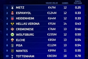 10、熱刺,陣容價值8.03億歐元,踢了18場比賽,場均0.78分