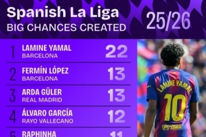 本季西甲創造機會數最多球員:亞馬爾22次第一,費爾明&拉菲在列