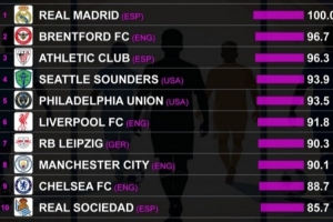 緊隨皇馬之后的是兩種截然不同但同樣高效的建隊模式。布倫特福德已鞏固為英超聯(lián)賽中最穩(wěn)健的項目之一,以優(yōu)化資源利用和維持穩(wěn)定性見長。畢爾巴鄂競技則堅守其傳統(tǒng)本色,持續(xù)打造具有延續(xù)性和集體感的球隊。
