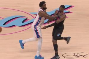 恩比德欲犯規不慎單手“扼”住阿德巴約喉嚨 裁判吹罰為普通犯規