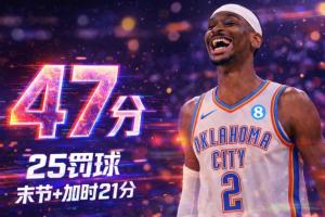 本場(chǎng)比賽,亞歷山大出戰(zhàn)41分鐘,投籃19中12,三分3中2,罰球25中21超活塞全隊(duì)(23罰),拿到47分5籃板3助攻2搶斷。
