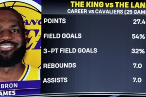 湖人主場迎戰騎士,轉播方曬出詹姆斯生涯VS騎士數據統計(25場):