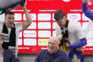 波黑主帥巴巴雷茨出席賽后發(fā)布會,波黑球員帶著音響闖入發(fā)布會現場,慶祝球隊晉級世界杯。