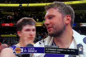 體育資訊3月26日訊 NBA常規賽,湖人客場137-130戰勝步行者。賽后東契奇接受了采訪。