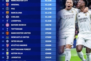 足壇俱樂部最新身價(jià)榜:皇馬13.4億歐居首,曼城13.1億歐次之