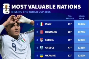 無(wú)緣世界杯球隊(duì)身價(jià)排名:意大利8.34億歐居首,丹麥3.75億歐次席