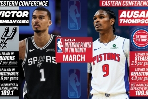 體育資訊4月3日訊 NBA官方公布了3月份的東西部月最佳防守球員,馬刺的文班亞馬和活塞的奧薩爾·湯普森分別當(dāng)選。