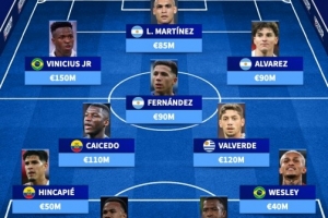 前鋒:維尼修斯(巴西、皇馬、1.5億歐)、勞塔羅(阿根廷、國米、8500萬歐)、阿爾瓦雷斯(阿根廷、馬競、9000萬歐)