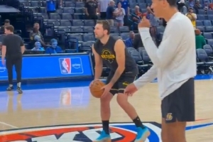 常規操作!東契奇賽前踩著Logo 兩記中場超遠三分連續命中