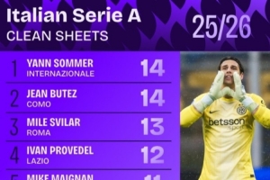 本賽季意甲零封榜:索默14次第一,邁尼昂第5、迪格雷戈里奧第7
