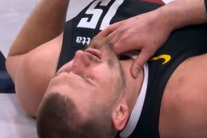 GIF-約基奇脖子位置被凱爾登無(wú)意打到