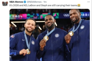 美媒NBA Memes曬出詹杜庫在巴黎奧運會的合照,配文寫道:“如今已是2026年,KD、詹姆斯和庫里依然在獨自扛著各自的球隊前行?!?/p>
