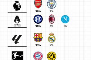 五大聯(lián)賽奪冠概率:阿森納96%,拜仁、巴黎99%,巴薩93%,國(guó)米98%