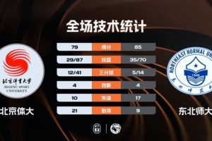 末節(jié)比賽,東北師大的進攻表現沒有絲毫好轉,可以說是更加糟糕,他們在前七分鐘的時間里只拿到6分,北京體大一波流直接完成反超,比賽懸念打到了最后,關鍵時刻王玖豪命中領先三分球,祖力布哈爾強投三分不中讓北京體大徹底失去機會,最終東北師大85-79險勝北京體大。